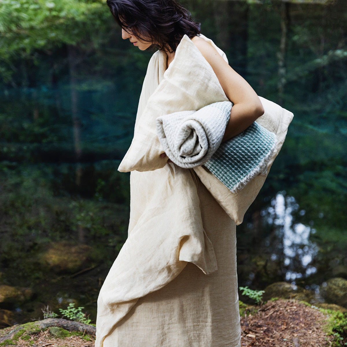 Our collection includes blankets and cushions, linen bedding, and sauna-bathing textiles. These products serve as the base for sustainable home decor that can be easily adjusted to suit your changing life situations. We want to inspire you to create spaces by freely combining materials, colors and shapes.